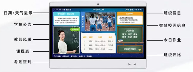 2、安裝在教室門(mén)口,除了展示班級(jí)信息、每日課程安排、授課老師、值日安排、班級(jí)文化展示、班級(jí)評(píng)比、榮譽(yù),活動(dòng)視頻等,還能顯示學(xué)校通知,公告等。