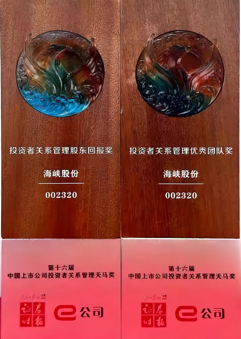 ? ? ? ? ?第十六屆上市公司投資者關系管理天馬獎評獎活動在揚州市舉行,海峽股份憑借在股東回報及投資者關系管理團隊實踐工作等方面的杰出表現,榮獲第十六屆中國上市公司“投資者關系管理股東回報獎”“優秀團隊獎”雙項殊榮。 ? ? ? ? ?第十六屆中國上市公司投資者關系管理天馬獎是由證券時報社主辦的資本市場獎項,旨在通過專業標準表彰在投資者關系管理領域表現卓越的企業,促進提升上市公司投資者關系管理水平。本屆評選共吸引2100余份自薦材料,其中50家公司榮獲優秀團隊獎,100家公司榮獲股東回報獎。 多年來,公司始終將股東利益放在重要位置,以持續穩定的分紅政策踐行對投資者的承諾。自2009年上市以來,公司累計實現凈利潤31.19億元,現金分紅高達16.51億元,平均分紅率52.93%。在充滿挑戰的2019-2023年間,公司平均分紅率仍高達76.6%,持續領先于市場。這份分紅政策的連續性與可持續性,為投資者提供了堅實的回報預期,顯著提升了公司的長期投資價值。 公司始終嚴格遵守相關監管要求及公司規章制度,在公司治理、信息披露、投資者關系管理和ESG(社會、環境與治理)等方面持續創新,取得一定成效。 雙項殊榮,既是榮耀,更是責任與動力。未來公司將持續秉持“規范治理、透明溝通、責任引領”的核心價值觀,不斷拓展資本運作的廣度與深度,靈活運用金融工具,創新管理模式,驅動公司高質量發展邁上新臺階,以更優異的業績回饋市場及廣大股東。 | |||||||