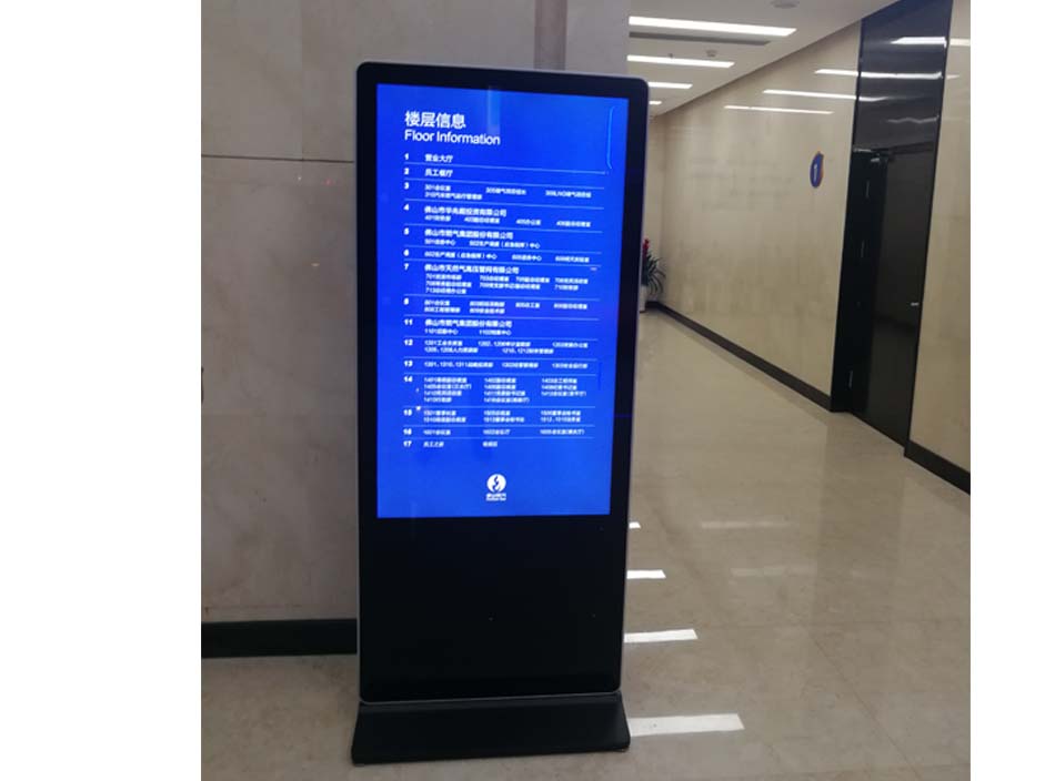 國(guó)有企業(yè)辦公大樓,電梯間安裝壁掛式廣告機(jī),用于播放企業(yè)文化,企業(yè)資訊;通道處擺放立式廣告機(jī),樓層信息指引。